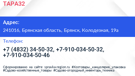 ТАРА32 по адресу 241016, Брянская область, Брянск, Колодезная, 19а в дальнейшем Организация, размещена в следующих категориях: