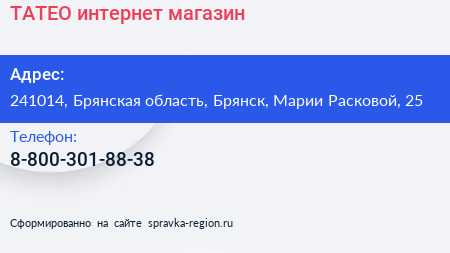 ТАТЕО, интернет-магазин по адресу 241014, Брянская область, Брянск, Марии Расковой, 25 в дальнейшем Организация, размещена в следующих категориях: