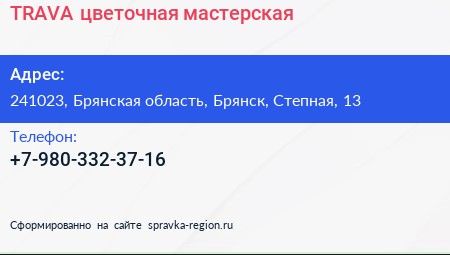 TRAVA, цветочная мастерская по адресу 241023, Брянская область, Брянск, Степная, 13 в дальнейшем Организация, размещена в следующих категориях: