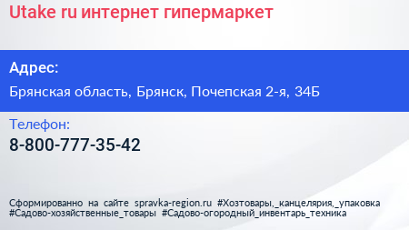 Utake.ru, интернет-гипермаркет по адресу Брянская область, Брянск, Почепская 2-я, 34Б в дальнейшем Организация, размещена в следующих категориях: