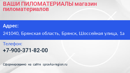 ВАШИ ПИЛОМАТЕРИАЛЫ, магазин пиломатериалов по адресу 241040, Брянская область, Брянск, Шоссейная улица, 1а в дальнейшем Организация, размещена в следующих категориях: