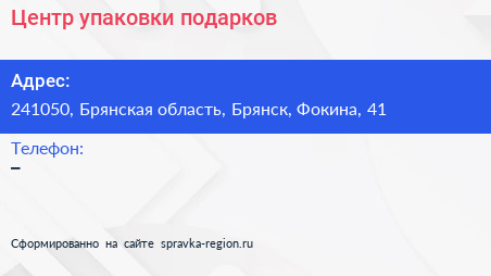 Центр упаковки подарков по адресу 241050, Брянская область, Брянск, Фокина, 41 в дальнейшем Организация, размещена в следующих категориях: