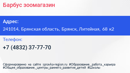 Барбус, зоомагазин по адресу 241014, Брянская область, Брянск, Литейная, 68 к2 в дальнейшем Организация, размещена в следующих категориях: