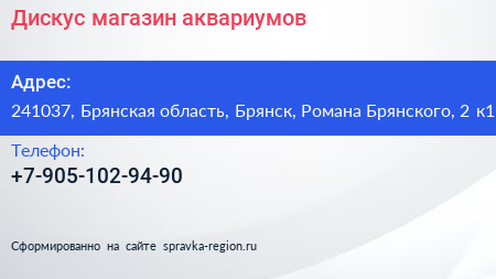Дискус, магазин аквариумов по адресу 241037, Брянская область, Брянск, Романа Брянского, 2 к1 в дальнейшем Организация, размещена в следующих категориях: