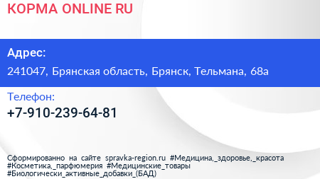 КОРМА ONLINE.RU по адресу 241047, Брянская область, Брянск, Тельмана, 68а в дальнейшем Организация, размещена в следующих категориях:
