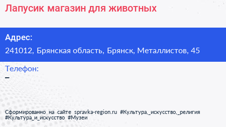 Лапусик, магазин для животных по адресу 241012, Брянская область, Брянск, Металлистов, 45 в дальнейшем Организация, размещена в следующих категориях: