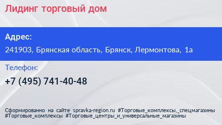 Лидинг, торговый дом по адресу 241903, Брянская область, Брянск, Лермонтова, 1а в дальнейшем Организация, размещена в следующих категориях:
