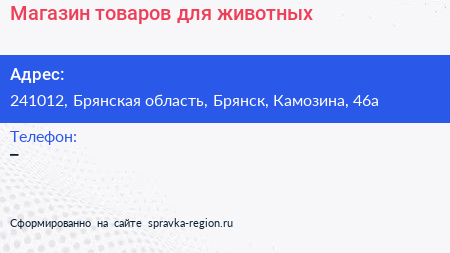 Магазин товаров для животных по адресу 241012, Брянская область, Брянск, Камозина, 46а в дальнейшем Организация, размещена в следующих категориях: