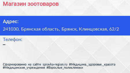 Магазин зоотоваров по адресу 241030, Брянская область, Брянск, Клинцовская, 62/2 в дальнейшем Организация, размещена в следующих категориях: