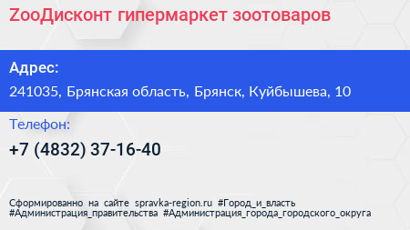 ZooДисконт, гипермаркет зоотоваров по адресу 241035, Брянская область, Брянск, Куйбышева, 10 в дальнейшем Организация, размещена в следующих категориях: