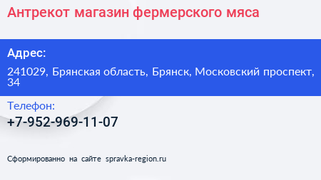 Антрекот, магазин фермерского мяса по адресу 241029, Брянская область, Брянск, Московский проспект, 34 в дальнейшем Организация, размещена в следующих категориях: