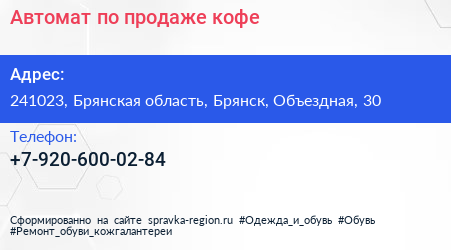 Автомат по продаже кофе по адресу 241023, Брянская область, Брянск, Объездная, 30 в дальнейшем Организация, размещена в следующих категориях: