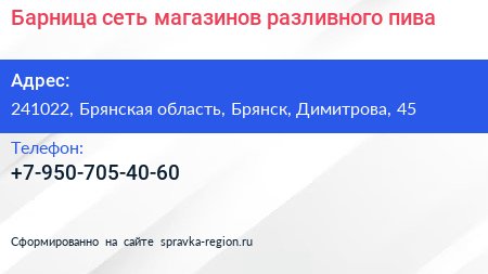 Барница, сеть магазинов разливного пива по адресу 241022, Брянская область, Брянск, Димитрова, 45 в дальнейшем Организация, размещена в следующих категориях: