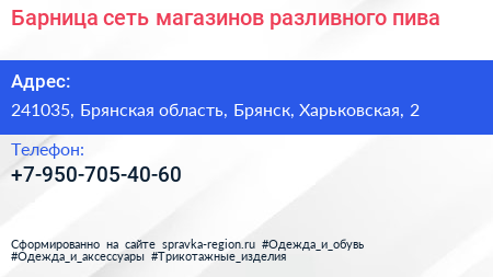 Барница, сеть магазинов разливного пива по адресу 241035, Брянская область, Брянск, Харьковская, 2 в дальнейшем Организация, размещена в следующих категориях: