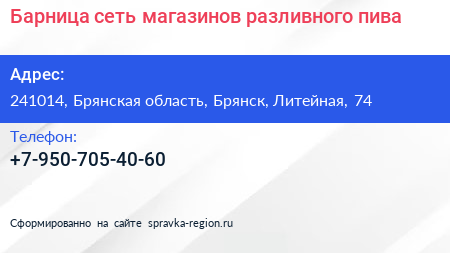 Барница, сеть магазинов разливного пива по адресу 241014, Брянская область, Брянск, Литейная, 74 в дальнейшем Организация, размещена в следующих категориях: