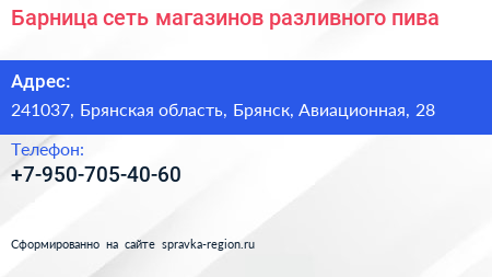 Барница, сеть магазинов разливного пива по адресу 241037, Брянская область, Брянск, Авиационная, 28 в дальнейшем Организация, размещена в следующих категориях: