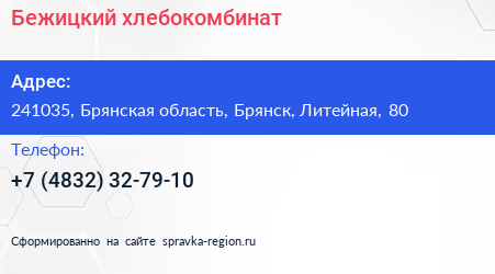 Бежицкий хлебокомбинат по адресу 241035, Брянская область, Брянск, Литейная, 80 в дальнейшем Организация, размещена в следующих категориях: