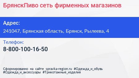 БрянскПиво, сеть фирменных магазинов по адресу 241047, Брянская область, Брянск, Рылеева, 4 в дальнейшем Организация, размещена в следующих категориях:
