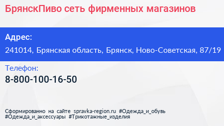 БрянскПиво, сеть фирменных магазинов по адресу 241014, Брянская область, Брянск, Ново-Советская, 87/19 в дальнейшем Организация, размещена в следующих категориях: