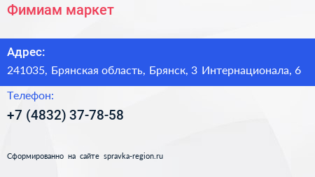 Фимиам, маркет по адресу 241035, Брянская область, Брянск, 3 Интернационала, 6 в дальнейшем Организация, размещена в следующих категориях: