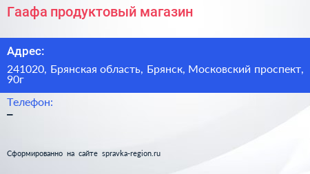 Гаафа, продуктовый магазин по адресу 241020, Брянская область, Брянск, Московский проспект, 90г в дальнейшем Организация, размещена в следующих категориях: