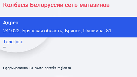 Колбасы Белоруссии, сеть магазинов по адресу 241022, Брянская область, Брянск, Пушкина, 81 в дальнейшем Организация, размещена в следующих категориях:
