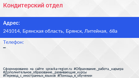 Кондитерский отдел по адресу 241014, Брянская область, Брянск, Литейная, 68а в дальнейшем Организация, размещена в следующих категориях: