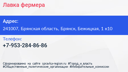 Лавка фермера по адресу 241007, Брянская область, Брянск, Бежицкая, 1 к10 в дальнейшем Организация, размещена в следующих категориях: