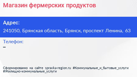 Магазин фермерских продуктов по адресу 241050, Брянская область, Брянск, проспект Ленина, 63 в дальнейшем Организация, размещена в следующих категориях: