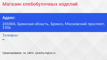 Магазин хлебобулочных изделий по адресу 241004, Брянская область, Брянск, Московский проспект, 150а в дальнейшем Организация, размещена в следующих категориях: