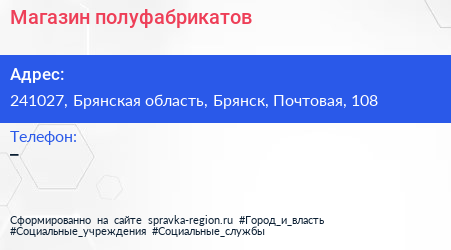 Магазин полуфабрикатов по адресу 241027, Брянская область, Брянск, Почтовая, 108 в дальнейшем Организация, размещена в следующих категориях: