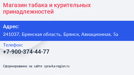 Магазин табака и курительных принадлежностей по адресу 241037, Брянская область, Брянск, Авиационная, 5а в дальнейшем Организация, размещена в следующих категориях: