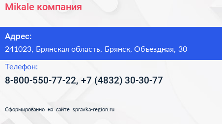 Mikale, компания по адресу 241023, Брянская область, Брянск, Объездная, 30 в дальнейшем Организация, размещена в следующих категориях: