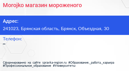 Morojko, магазин мороженого по адресу 241023, Брянская область, Брянск, Объездная, 30 в дальнейшем Организация, размещена в следующих категориях: