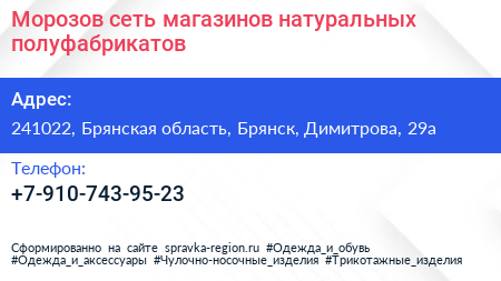 Морозов, сеть магазинов натуральных полуфабрикатов по адресу 241022, Брянская область, Брянск, Димитрова, 29а в дальнейшем Организация, размещена в следующих категориях: