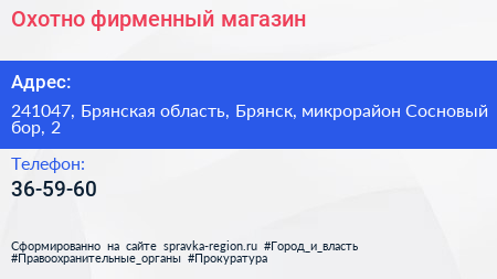 Охотно, фирменный магазин по адресу 241047, Брянская область, Брянск, микрорайон Сосновый бор, 2 в дальнейшем Организация, размещена в следующих категориях: