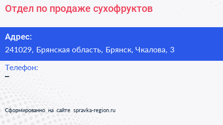 Отдел по продаже сухофруктов по адресу 241029, Брянская область, Брянск, Чкалова, 3 в дальнейшем Организация, размещена в следующих категориях: