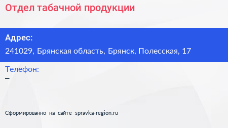 Отдел табачной продукции по адресу 241029, Брянская область, Брянск, Полесская, 17 в дальнейшем Организация, размещена в следующих категориях: