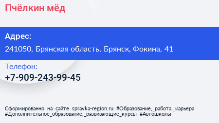 Пчёлкин мёд по адресу 241050, Брянская область, Брянск, Фокина, 41 в дальнейшем Организация, размещена в следующих категориях: