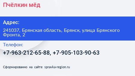 Пчёлкин мёд по адресу 241037, Брянская область, Брянск, улица Брянского Фронта, 2 в дальнейшем Организация, размещена в следующих категориях: