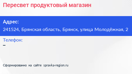 Пересвет, продуктовый магазин по адресу 241524, Брянская область, Брянск, улица Молодёжная, 2 в дальнейшем Организация, размещена в следующих категориях: