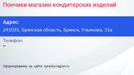Пончики, магазин кондитерских изделий по адресу 241035, Брянская область, Брянск, Ульянова, 51а в дальнейшем Организация, размещена в следующих категориях:
