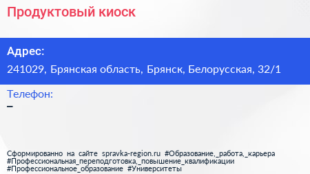 Продуктовый киоск по адресу 241029, Брянская область, Брянск, Белорусская, 32/1 в дальнейшем Организация, размещена в следующих категориях: