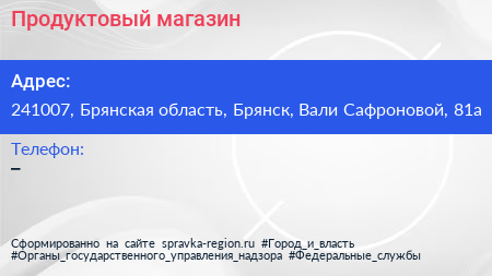 Продуктовый магазин по адресу 241007, Брянская область, Брянск, Вали Сафроновой, 81а в дальнейшем Организация, размещена в следующих категориях: