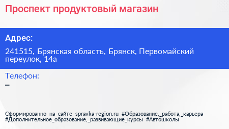 Проспект, продуктовый магазин по адресу 241515, Брянская область, Брянск, Первомайский переулок, 14а в дальнейшем Организация, размещена в следующих категориях: