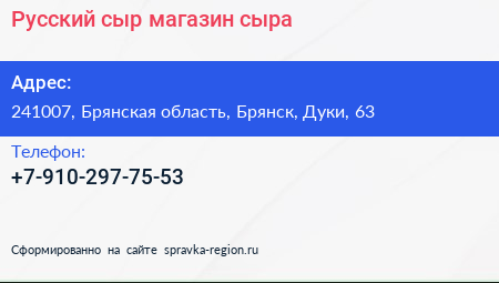 Русский сыр, магазин сыра по адресу 241007, Брянская область, Брянск, Дуки, 63 в дальнейшем Организация, размещена в следующих категориях: