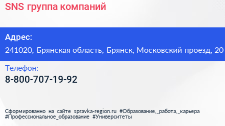 SNS, группа компаний по адресу 241020, Брянская область, Брянск, Московский проезд, 20 в дальнейшем Организация, размещена в следующих категориях: