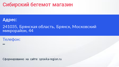 Сибирский бегемот, магазин по адресу 241035, Брянская область, Брянск, Московский микрорайон, 44 в дальнейшем Организация, размещена в следующих категориях: