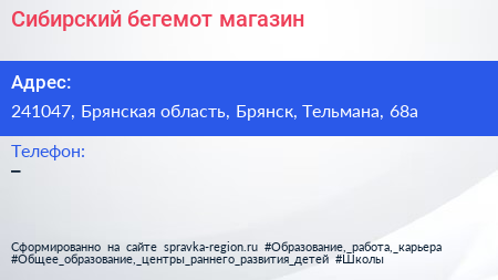 Сибирский бегемот, магазин по адресу 241047, Брянская область, Брянск, Тельмана, 68а в дальнейшем Организация, размещена в следующих категориях: