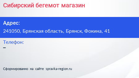 Сибирский бегемот, магазин по адресу 241050, Брянская область, Брянск, Фокина, 41 в дальнейшем Организация, размещена в следующих категориях: